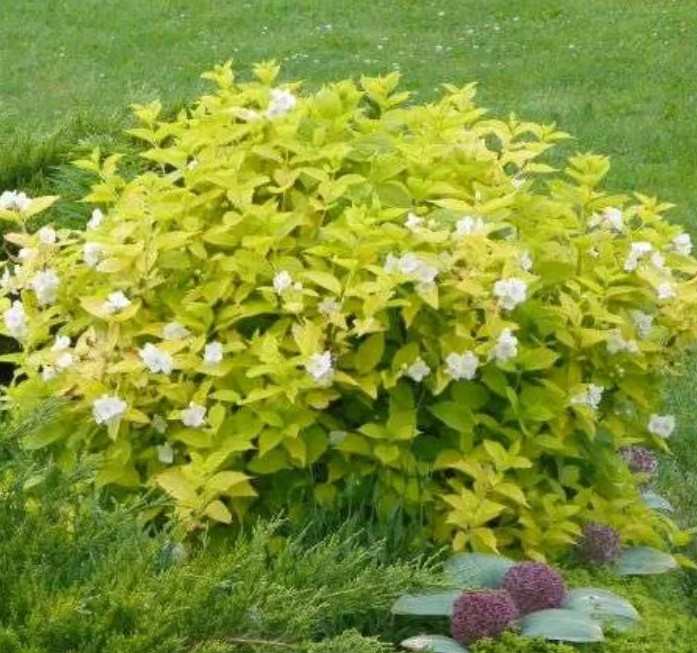 Чубушник 'Ауреус' (Philadelphus coronarius 'Aureus') – это великолепный декоративный кустарник, который станет настоящим украшением вашего сада. Его яркие золотисто-желтые листья создают эффектный контраст с белоснежными цветами, которые распускаются в начале лета и наполняют воздух нежным ароматом жасмина.